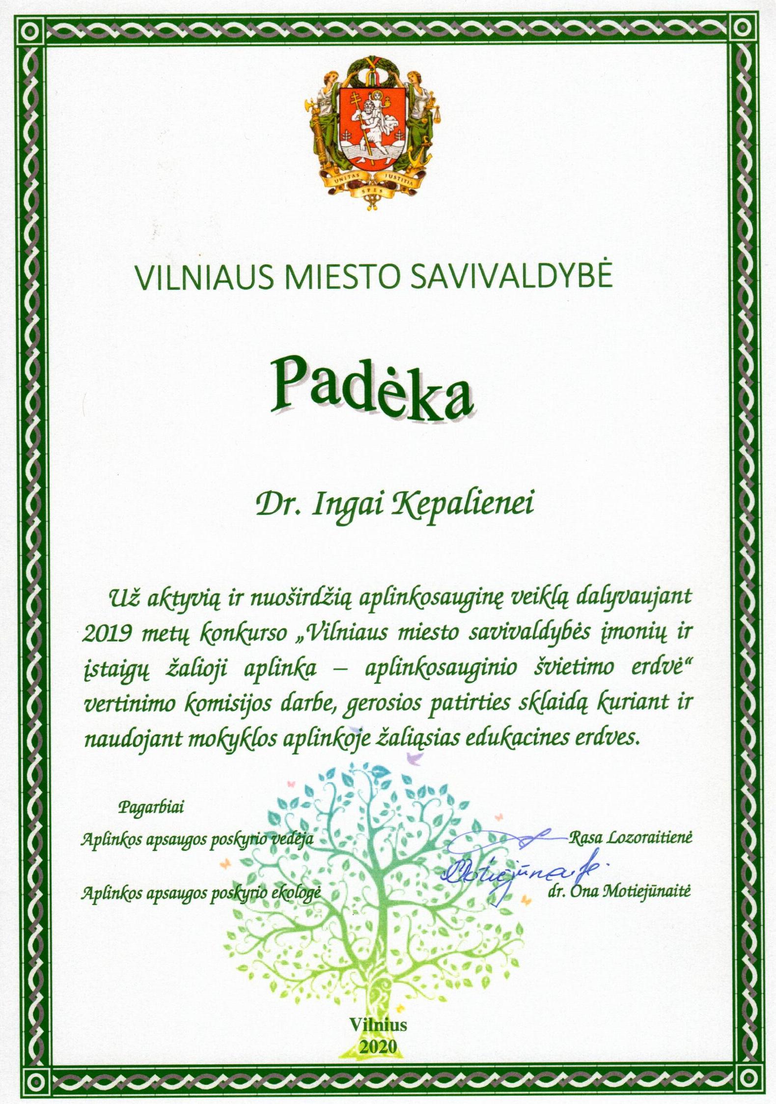 Vilniaus kolegijos Menų ir kūrybinių technologijų fakulteto dėstytoja dr. Inga Kepalienė dalyvavo Vilniaus miesto savivaldybės organizuoto konkurso „Vilniaus miesto savivaldybės įmonių ir įstaigų žalioji aplinka – aplinkosauginio švietimo erdvė” vertinimo komisijos darbe. 2019 m. stebėtos priešmokyklinio ir bendrojo ugdymo įstaigų žaliosios edukacinės erdvės, gamtos ekspozicijų išdėstymas, netradicinis erdvių pritaikymas edukacijai, išteklių tausojimo ir antrinio daiktų panaudojimo pavyzdžiai suteikė galimybę patobulinti bendrąsias, didaktines, dalykines ir gamtamokslines kompetencijas. Konkursas vyko keliais etapais, 2020 m. pradžioje aptarti konkurso rezultatai ir išrinkti nugalėtojai.