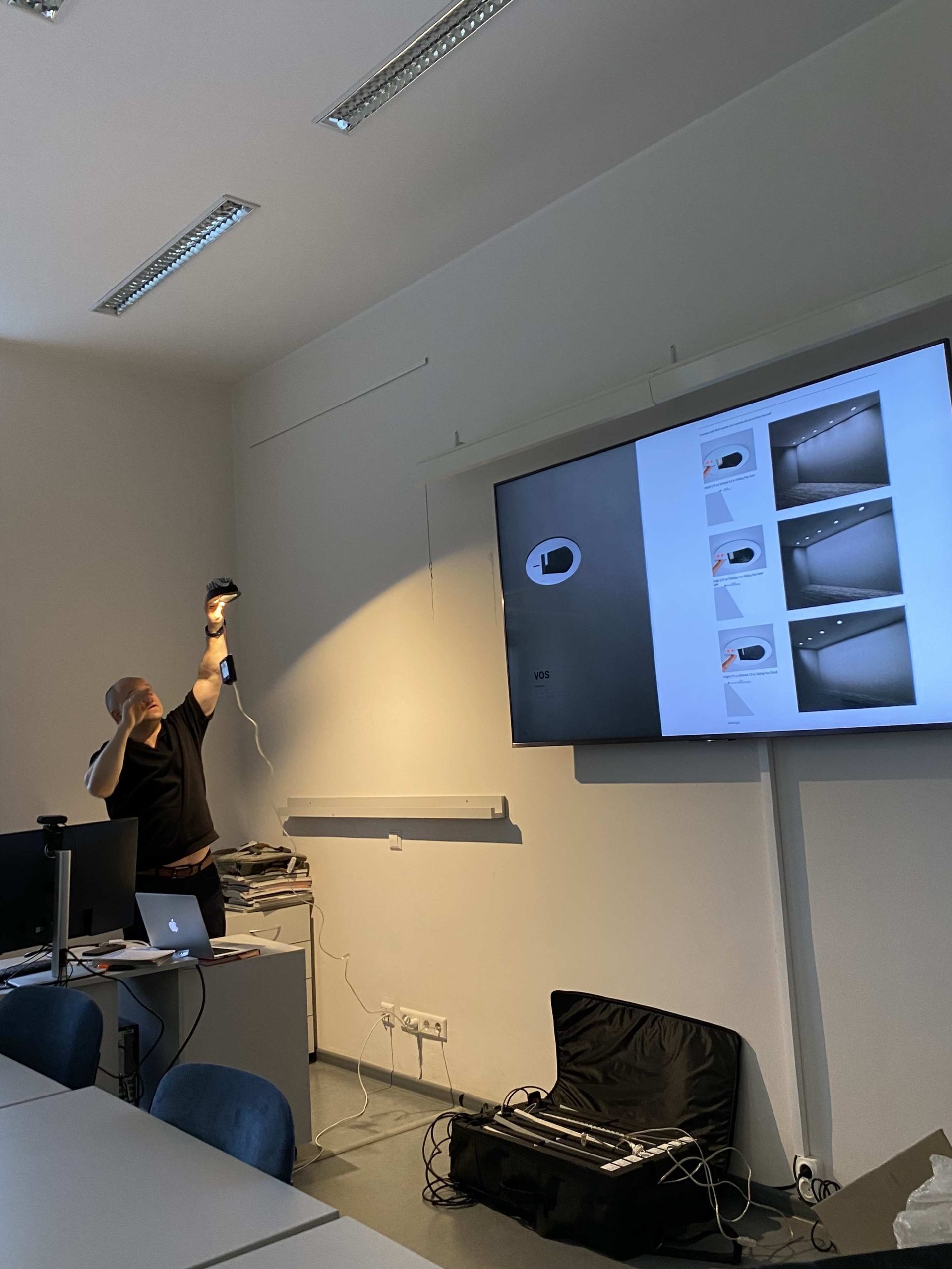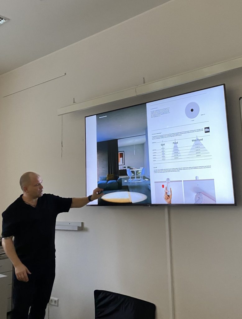 Buvo pademonstruoti konkretūs gaminiai, jų šviesos sklaidos efektai ir taikymo galimybės, projektuojant interjero apšvietimą. Susitikimą su svečiu organizavo ir moderavo Dizaino katedros lektorė Vilija Daugėlaitė.