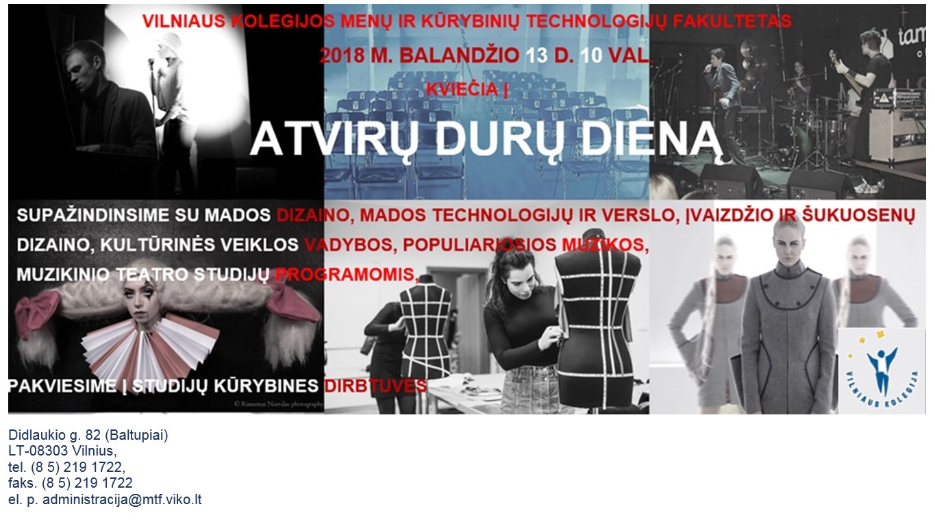 Supažindinsime su Mados dizaino, Mados technologijų ir verslo, Įvaizdžio ir Šukuosenų dizaino, Kultūrinės veiklos vadybos, Populiariosios muzikos, Muzikinio teatro studijų programomis, pakviesime į studijų kūrybines dirbtuves.
