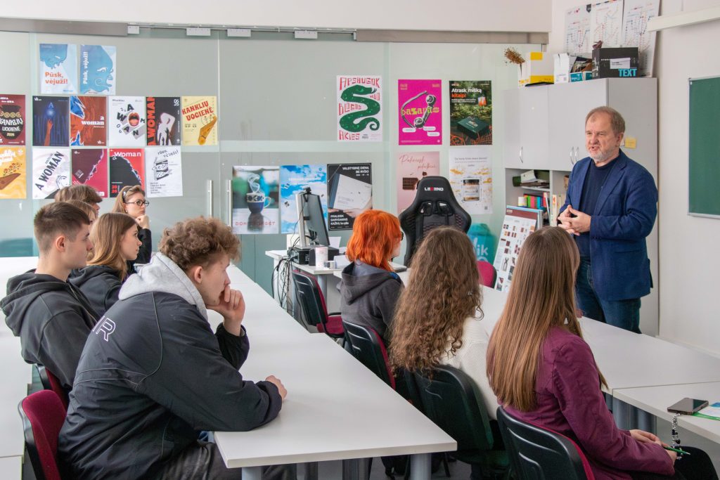 Lektorius Jonas Malinauskas susirinkusiems pristatė Grafinio dizaino studijų programą – parodė studentų darbų pavyzdžių, papasakojo apie studijoms keliamus reikalavimus ir dizainerių profesinės karjeros perspektyvas. Moksleiviai gyvai domėjosi stojamųjų egzaminų užduotimis, darbų vertinimo kriterijais, studijoms reikalingomis kompiuterinėmis programomis.