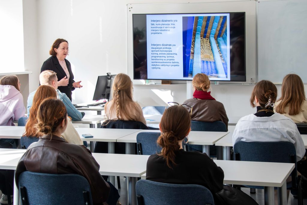 Atvirų durų dienos metu moksleiviai buvo supažindinti ir su Interjero dizaino studijų programa, jos turiniu, kūrybiniais principais ir studijų aplinka. Renginio pradžioje pristatyta studijų struktūra, pagrindiniai studijų dalykai, kūrybinių kompetencijų ugdymo kryptys bei darbo perspektyvos baigus programą. Studentų darbų pavyzdžiai padėjo aiškiau suprasti studijų specifiką ir kūrybinį procesą. Renginio metu išsamiai paaiškinti stojamųjų egzaminų reikalavimai: kokie kūrybiniai gebėjimai vertinami, kaip vyksta stojamasis piešimo ir kompozicijos egzaminas, kokie vertinimo kriterijai taikomi. Moksleiviams buvo pristatyti kursai stojantiesiems, kad galėtų tinkamai pasiruošti stojamajam egzaminui. Po pristatymo dalyviai pakviesti apsilankyti braižyklose ir kompiuterinėse auditorijose. Čia jie galėjo susipažinti su naudojama programine įranga, projektavimo įrankiais ir darbo atmosfera, pamatyti realiai vykstančias užduotis bei studentų darbo vietas. Taip pat moksleiviams pristatyta studentų autorinių šviestuvų paroda, kurioje eksponuojami kūrybiniai objektai atskleidė studentų dizaino mąstymą, medžiagų interpretacijas. Buvo pademonstruoti ir kursinių darbų pavyzdžiai – interjero projektai, vizualizacijos, maketai. Tai leido moksleiviams įvertinti studijų metu pasiekiamą žinių bei gebėjimų lygį ir įsivaizduoti savo paties galimybes. Renginys suteikė išsamų, įkvepiantį ir informatyvų žvilgsnį į interjero dizainerio profesiją, studijų procesą bei kūrybinę atmosferą, kurioje studentai kuria savo pirmuosius profesionalius darbus.