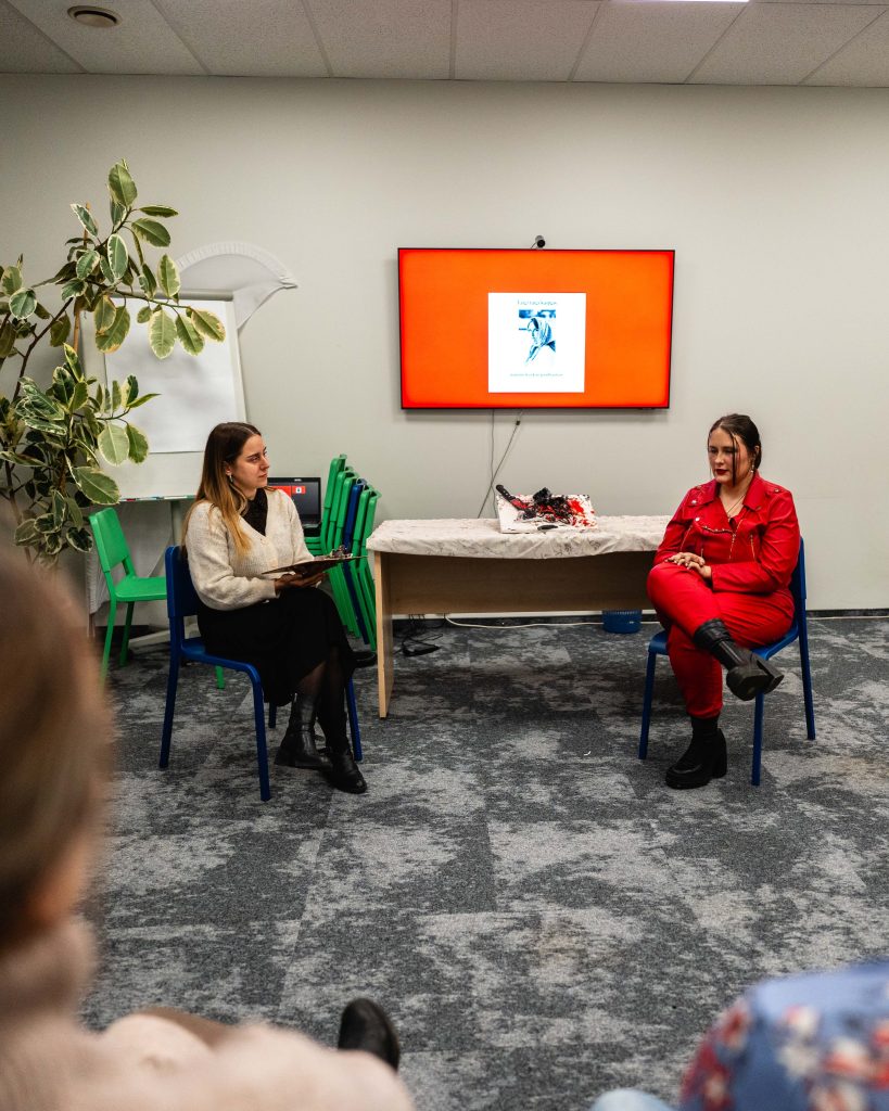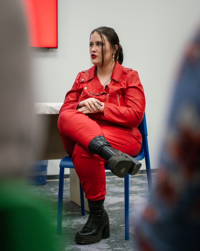 Po performanso vykusioje diskusijoje „Menas kaip veidrodis ir veiksmas“ aptarta parodos ir performanso idėjos kilmė, Simonos pasirinkimas feminizmą laikyti savo kūrybine kryptimi.