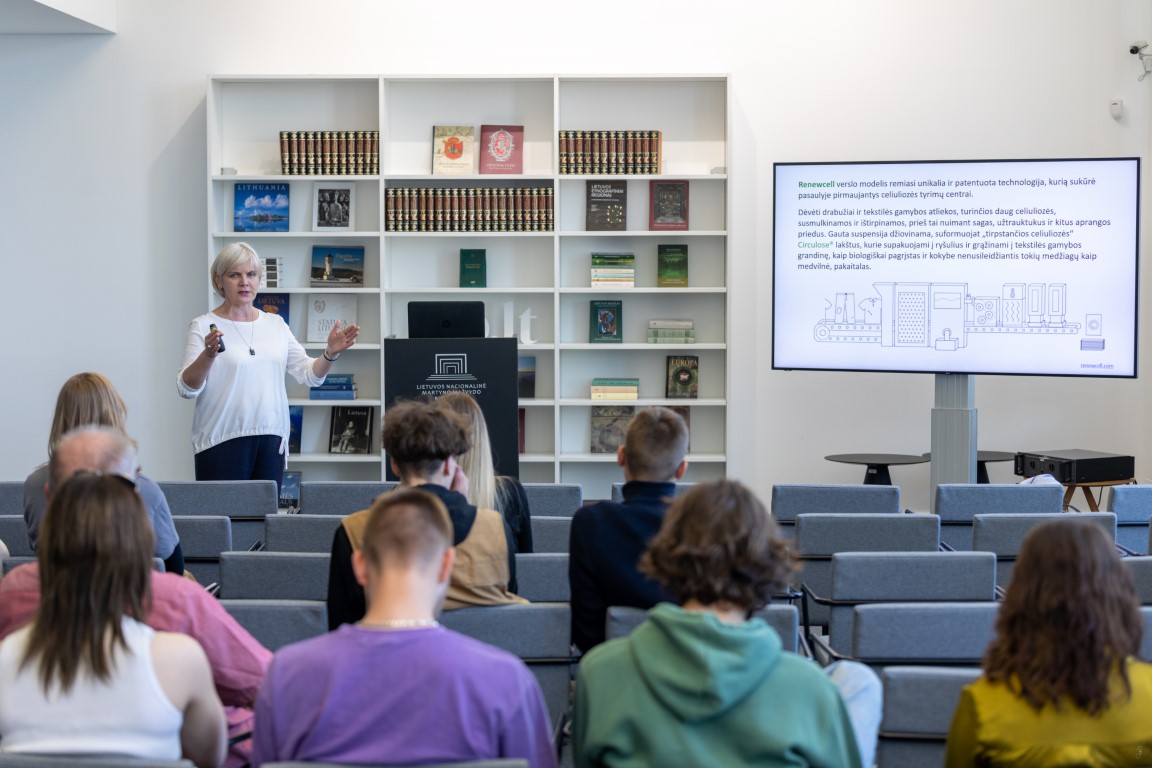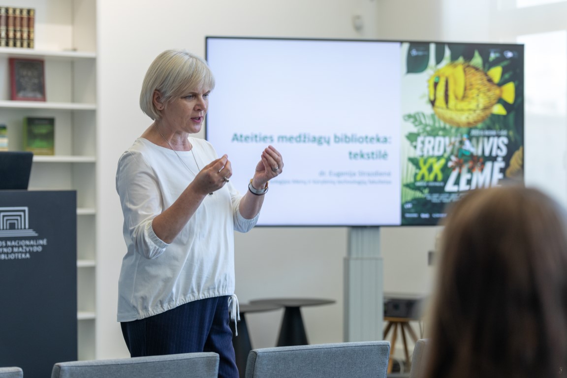 Birželio 5 d. Lietuvos nacionalinės Martyno Mažvydo bibliotekos renginių erdvėje Mados dizaino katedros profesorė dr. Eugenija Strazdienė vedė paskaitą „Ateities medžiagų biblioteka: tekstilė“. Profesorė kalbėjo apie medžiagas iš dilgėlių, bananų, ananasų, kokosų, jūržolių ir mūsų maisto atliekų… Apie tekstilę, kuri tręšia nederlingus žemės plotus bei gydo žmones. Taip pat ieškojo atsakymo į klausimą: ar išties didžiuosimės suadytais drabužiais?