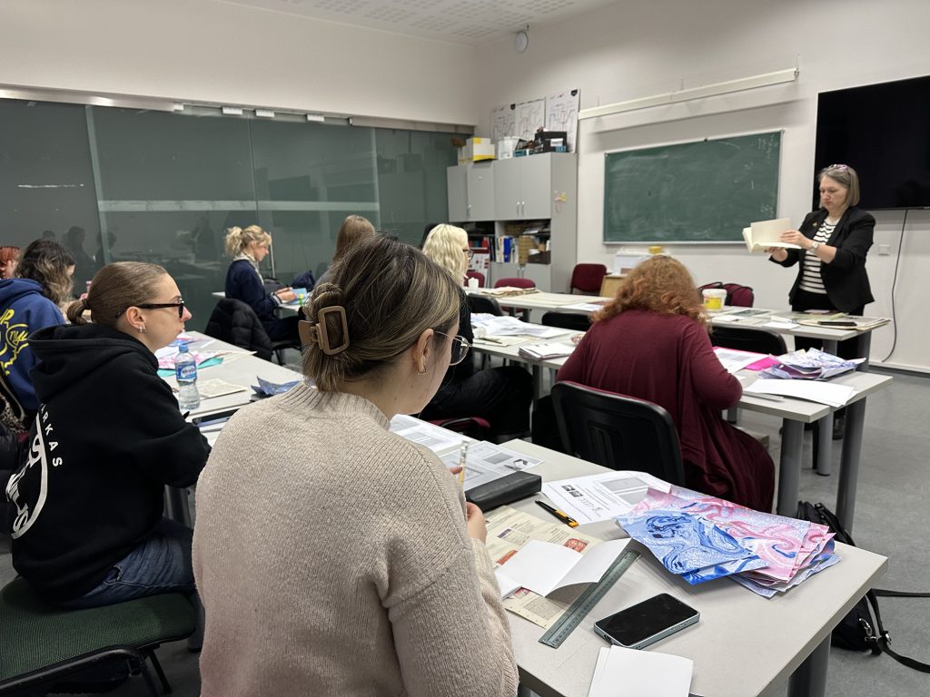 Vilniaus kolegijos Menų ir dizaino fakulteto Grafinio dizaino studijų programos trečio kurso studentams vyko knygos įrišimo dirbtuvės, kurias vedė knygų dailininkė Loreta Uzdraitė.