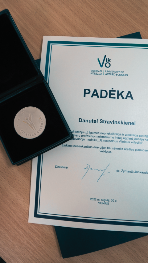 Rugsėjo 28 d. Menų ir kūrybinių technologijų fakulteto administracijos bei Mados dizaino katedros atstovai su meile ir pačiais gražiausiais žodžiais atsisveikino su ilgamete praktikų centro praktikų vadove Danute Stravinskiene. MTF dekanė dr. Birutė Žygaitienė padėkojo ir Vilniaus Kolegijos direktorės dr. Žymantės Jankauskienės vardu iškilmingai įteikė padėkos raštą ir Kolegijos medalį už ilgametį, pasišventimo kupiną darbą. Po ilgų 49 pedagoginio darbo metų kolegos nuoširdžiai dėkojo Danutei už jos begalinę kantrybę, rūpestį, geranorišką pagalbą, profesines žinias ir žmogišką šilumą.