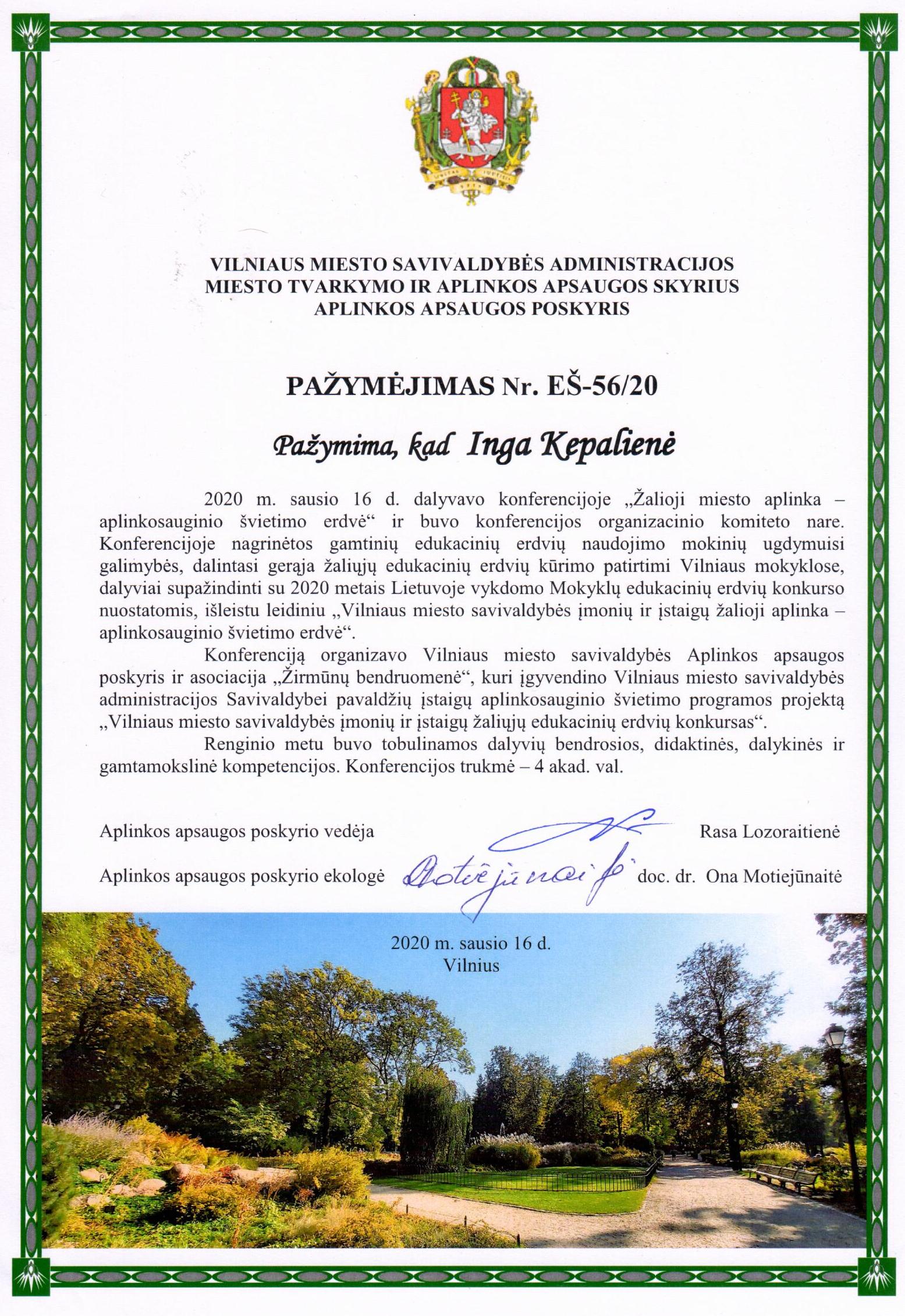 2020 m. sausio 16 d. dr. Inga Kepalienė dalyvavo konferencijoje „Žalioji miesto aplinka – aplinkosauginio švietimo erdvė“ ir buvo organizacinio komiteto narė. Konferencijoje nagrinėtos gamtinių edukacinių erdvių naudojimo ugdymuisi galimybės, jų funkcionalumas, dalintasi gerąja žaliųjų edukacinių erdvių kūrimo švietimo įstaigose patirtimi. Skirtingų įstaigų specialistų bendradarbiavimą įprasmino konferencijos dalyviams pristatytas naujas leidinys apie Vilniaus ugdymo įstaigų žaliąsias edukacines erdves. Dėkojame Vilniaus miesto savivaldybės Aplinkos apsaugos poskyrio ekologei doc. dr. Onai Motiejūnaitei už kvietimą vertinti švietimo įstaigų žaliąsias aplinkas ir edukacines erdves bei dalyvauti konferencijos organizaciniame komitete.