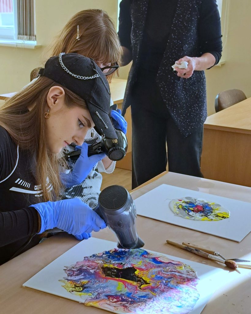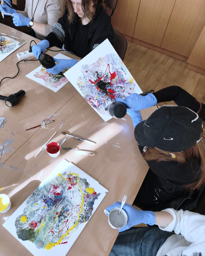 Užsiėmimo metu dalyviai ne tik aktyviai įsitraukė į kūrybinę veiklą, eksperimentavo su tapybos metodais, leidžiančiais kurti organiškas, spontaniškai susiformuojančias spalvines struktūras, bet ir dalijosi idėjomis bei patirtimi. Tokios veiklos skatina naujas vizualinės raiškos galimybes, kurios gali būti pritaikomos tiek tekstilės, tiek mados dizaino projektuose.