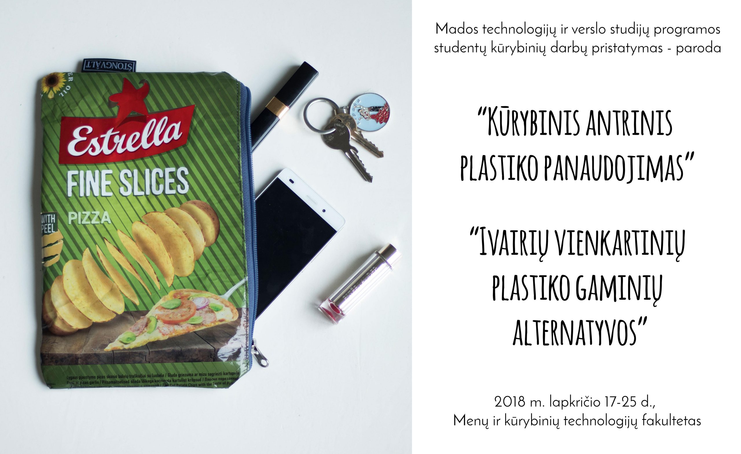 Visą Europos atliekų mažinimo renginių savaitę, lapkričio 17-25 dienomis, Menų ir kūrybinių technologijų fakultete veikė studentų kūrybinių darbų pristatymas- paroda „Kūrybinis antrinis plastiko panaudojimas“ bei „Įvairių vienkartinių plastiko gaminių alternatyvos“. „Plastikas yra svarbi mūsų ekonomikoje ir kasdieniame gyvenime naudojama medžiaga, tačiau vienas ryškiausių nerimauti verčiančių ženklų yra milijonai tonų plastiko šiukšlių, kasmet plūstančių į vandenynus. Bene daugiausiai plastiko patenka į aplinką panaudojus vienkartinius plastikinius gaminius, nes jie gali būti sunkiai perdirbami, dažnai panaudojami ne namuose ir numetami. “ (citata iš Aplinkos ministerijos kvietimo dalyvauti Europos atliekų mažinimo savaitės renginių organizavime“). Suprasdamos šias ekologijai grėsmingas problemas Mados technologijų ir verslo studijų programos studentės, vadovaujamos Mados dizaino katedros dėstytojų Ramintos Kalvaitienės ir Ramutės Puodžiukynienės, kūrė ir gamino įvairius realiai naudojamus gaminius, siekdamos pademonstruoti plastiko antrinio panaudojimo galimybes arba siūlydamos vienkartinio plastiko alternatyvas. Viena dalis AG16 grupės studenčių, naudodamos UAB „Mano Aplinka“ atiduotus nukritusių medžių lapų surinkimo maišus bei aprangos gamybos įmonėse nebenaudojamų medžiagų atraižas, furnitūrą pagamino įvairius šiuolaikiškai ir patraukliai atrodančius galanterijos gaminius (kuprines, kasdieninio naudojimo daugiafunkcinius krepšius, nešiojamojo kompiuterio dėklą, skalbinių ar depozito sistemoje dalyvaujančių vienkartinių pakuočių rinkimo krepšį). Kitos AG16 grupės studentės atliko vienkartinio plastiko fizinių savybių kitimo praktinius bandymus, tyrė, kaip keičiasi plastiko savybės veikiant karščiui, kelių sluoksnių susilydymo galimybes, tikrino siūlių tvirtumą. Padariusios išvadas, parinkusios tinkamą gamybos technologiją ir panaudodamos prekybos centrų plastikinius apsipirkimo maišelius, audinių rulonų įpakavimo plastikinius maišus, studentės pagamino originalius aksesuarus. Parodos lankytojų dėmesį patraukė nuotaikinga virtuvinė prijuostė, pagaminta iš įvairių plastikinių maisto pakuočių (saldainių, traškučių, šokolado, kavos ir pan.); delninės-dėtuvės, pasiūtos iš traškučių įpakavimo maišelių. Parodoje pristatytos ir vienkartinių maišelių vartojimo alternatyvos: įvairūs siūtiniai maišeliai iš senų užuolaidų bei tinklinių medžiagų. Namų aplinkoje juose galima saugiai ir stilingai laikyti, sandėliuoti daržoves ir vaisius. Taip pat labai patogu, o kartu ir atsakinga juos naudoti apsiperkant prekybos centruose, turguose ar pan.