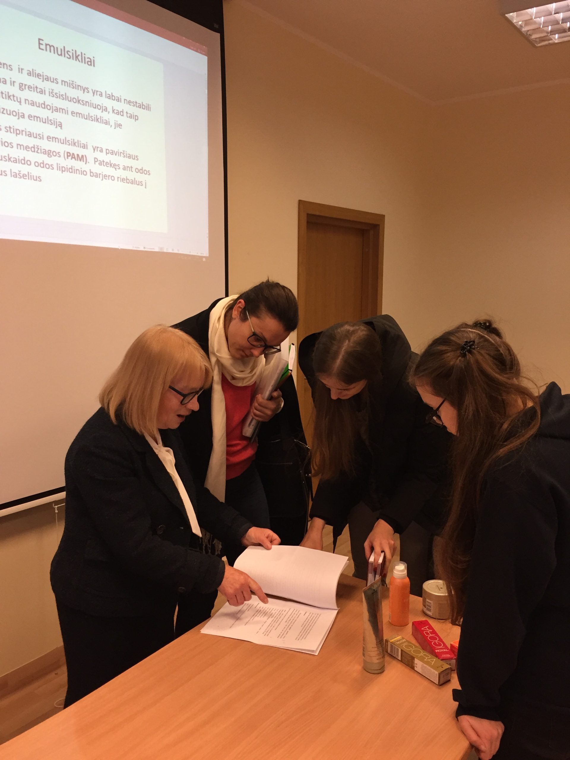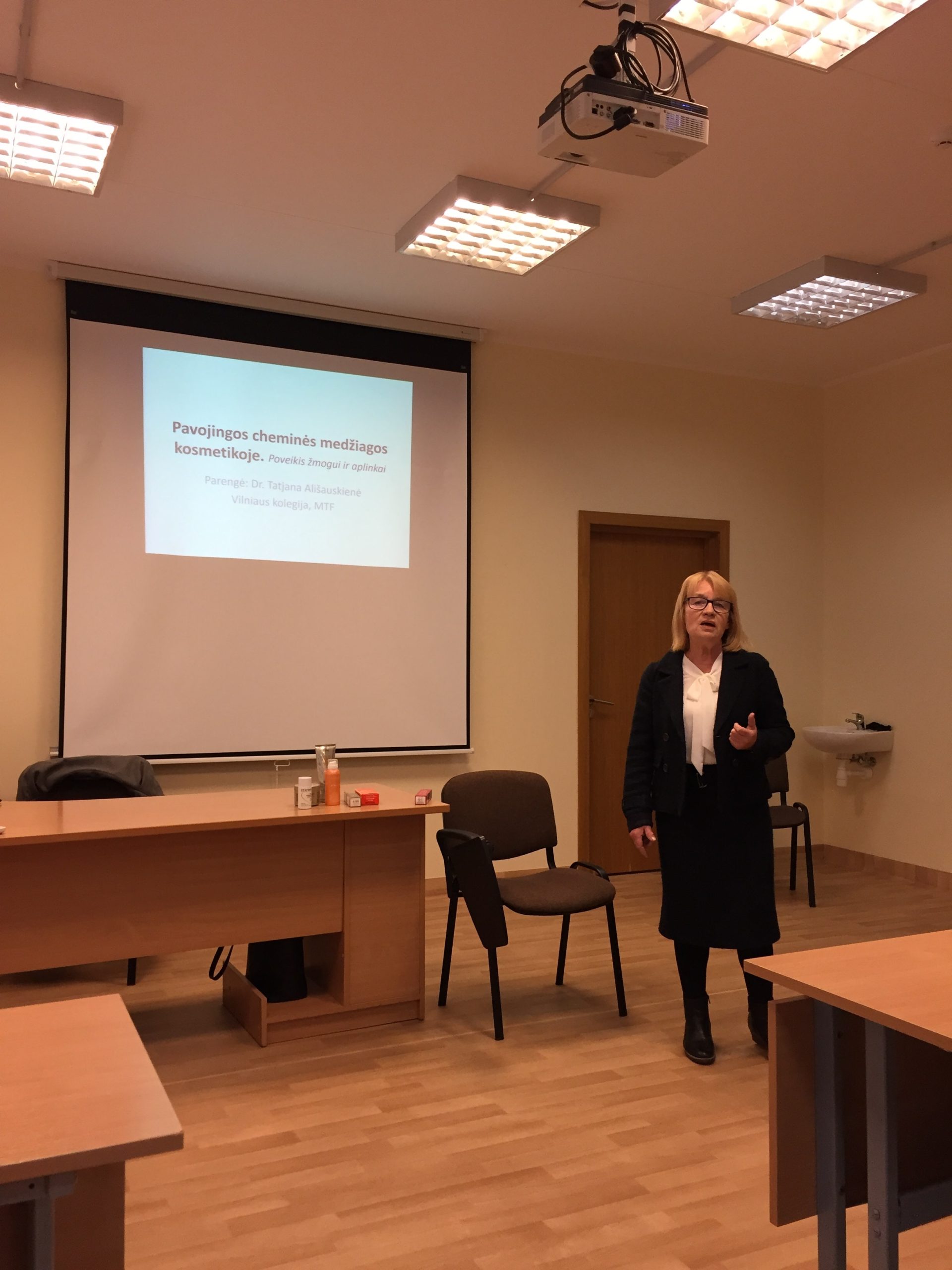 Prof. dr. Tatjana Ališauskienė pravedė paskaitą „Pavojingos cheminės medžiagos kosmetikoje. Poveikis žmogui ir aplinkai“. Dėstytoja pabrėžė, jog naudojant kosmetiką pavojingos cheminės medžiagos patenka ir į organizmą, ir į aplinką. Supažindino su pavojingiausiais neigiamu poveikiu pasižyminčiais kosmetikos gaminių komponentais; patarė, kokių cheminių medžiagų reiktų vengti, skatino aktyviau domėtis įvairių kosmetikos priemonių etiketėse pateikiama informacija apie cheminę sudėtį. Labai svarbu atsakingai rinktis gaminius, kurie būtų saugūs žmogui ir gamtai. Profesorė išaiškino, kaip ir kodėl svarbu sumažinti produktų su pavojingais komponentais vartojimą.