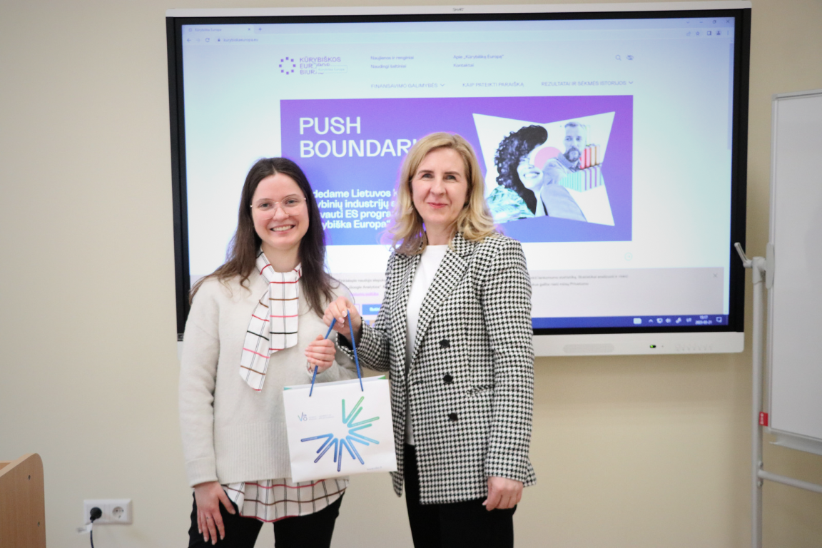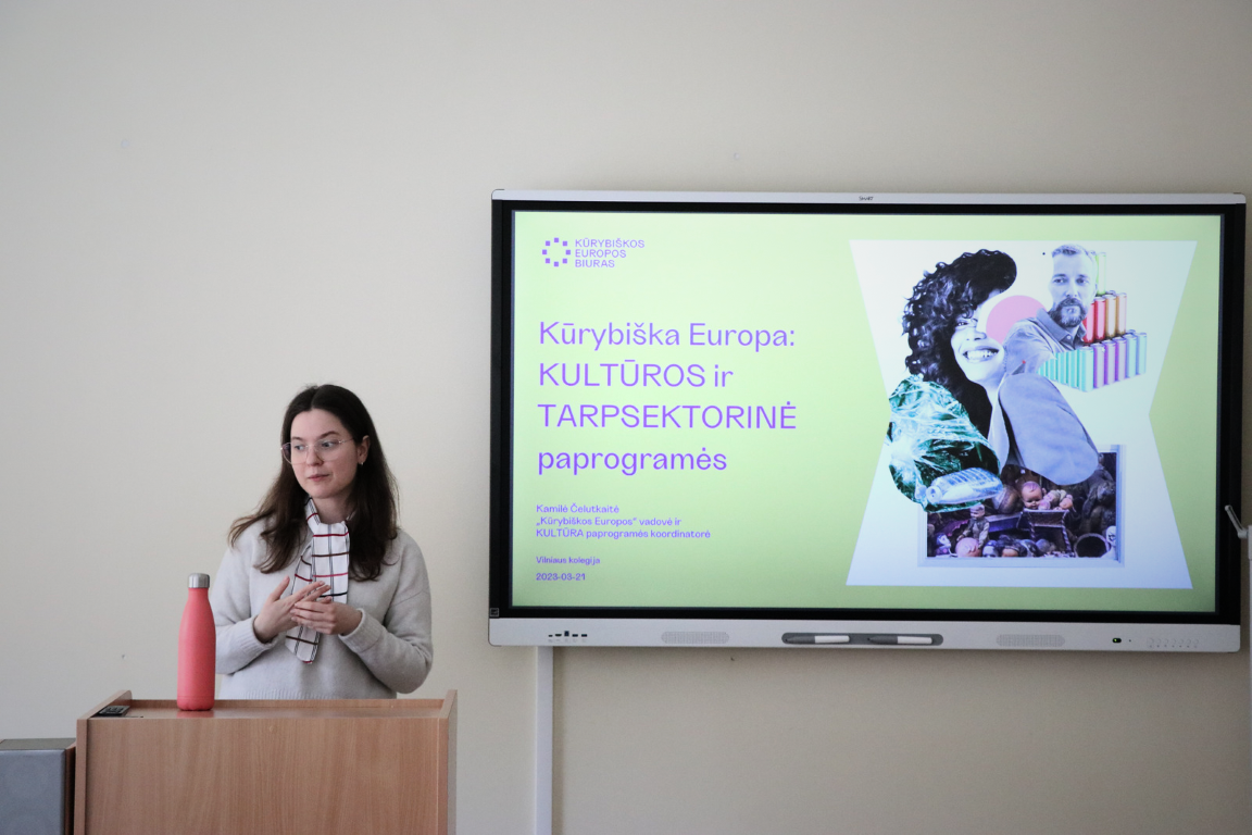 Kovo 21 d. Menų ir kūrybinių technologijų fakultete „Kūrybiškos Europos“ biuro Lietuvoje vadovė ir KULTŪRA paprogramės koordinatorė Kamilė Čelutkaitė fakulteto studentams ir dėstytojams vedė paskaitą, kurios metu bendrais bruožais pristatyta ES kultūros politika, ES programos „Kūrybiška Europa“ kvietimai projektų finansavimui gauti, kūrėjų mobilumo programa „Culture Moves Europe“, programos „Europos Horizontas“ kvietimai kultūrai, pasidalinta sėkmingai vykdomų Lietuvos pareiškėjų projektais bei patarimais, į ką rekomenduojama atkreipti dėmesį svarstant dalyvavimą kvietimuose ir pildant paraiškas.