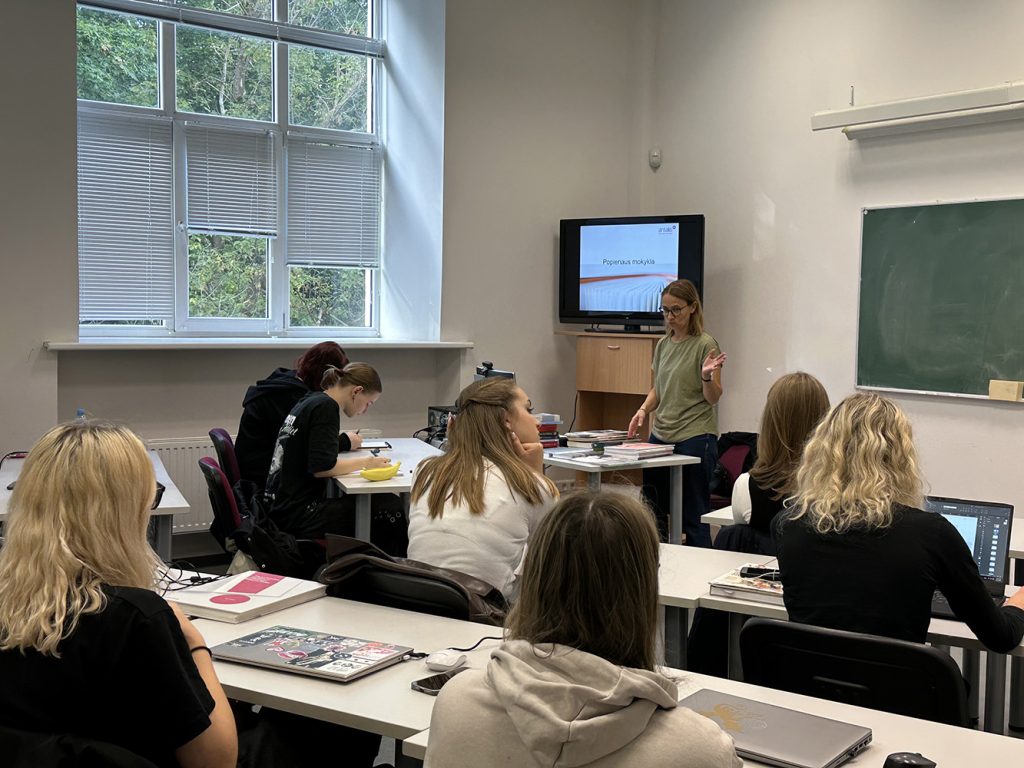 Susitikimo metu buvo pristatyta popieriaus bei įrišimo medžiagų įvairovė, aptartos svarbiausios jų savybės, į kurias būtina atkreipti dėmesį kuriant leidinių projektus. Konsultantė dalijosi ne tik techninėmis žiniomis, bet ir praktine patirtimi bei įžvalgomis, kurios svarbios būsimiems dizaino profesionalams.