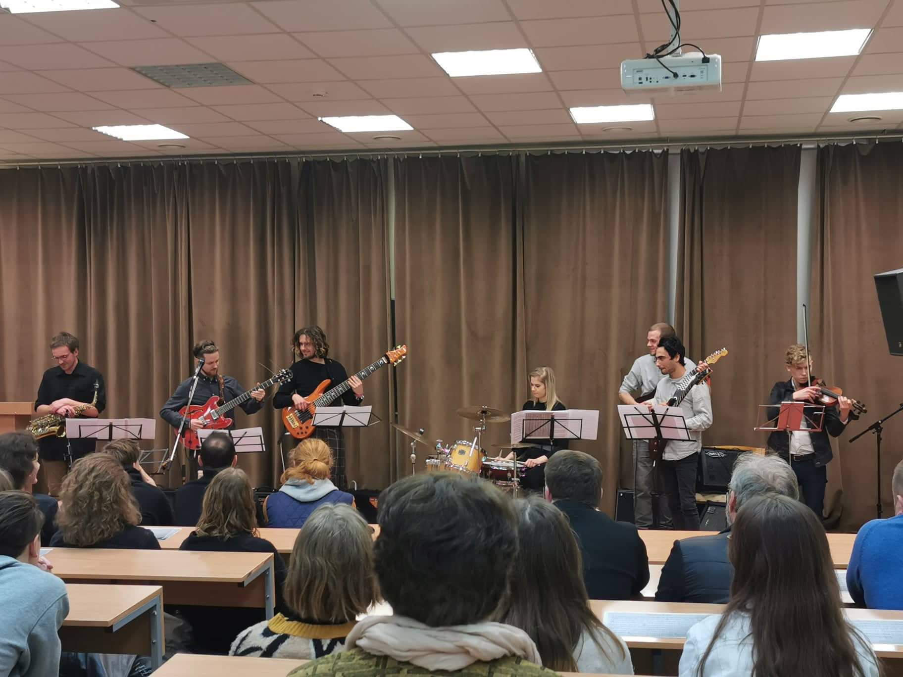 Studentų ansamblio dalyviai susitiko su menų gimnazijos mokiniais, kuriuos trumpai supažindino su Populiariosios muzikos studijų programa ir surengė koncertą, pristatydami įvairią džiazo bei šiuolaikinę muziką.
