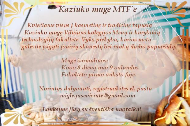 Kviečiame į Kaziuko mugę kuri vyks jau kovo 8 dieną. Primename, jog galite registruotis el. paštu – migle.jaseviciute@gmail.com ir šventės metu patys galėsite pardavinėti savo darbo gaminius. Kviečiame visus!