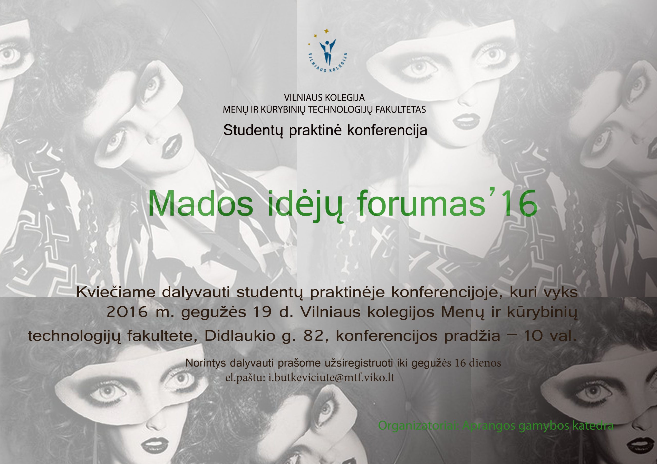 Kviečiame dalyvauti studentų praktinėje konferencijoje, kuri vyks  2016 m. gegužės 19 d. Vilniaus kolegijos Menų ir kūrybinių technologijų fakultete, Didlaukio g. 82,  Vilniuje. Dalyvių registracija nuo 9:30 val. Konferencijos pradžia – 10 val.
