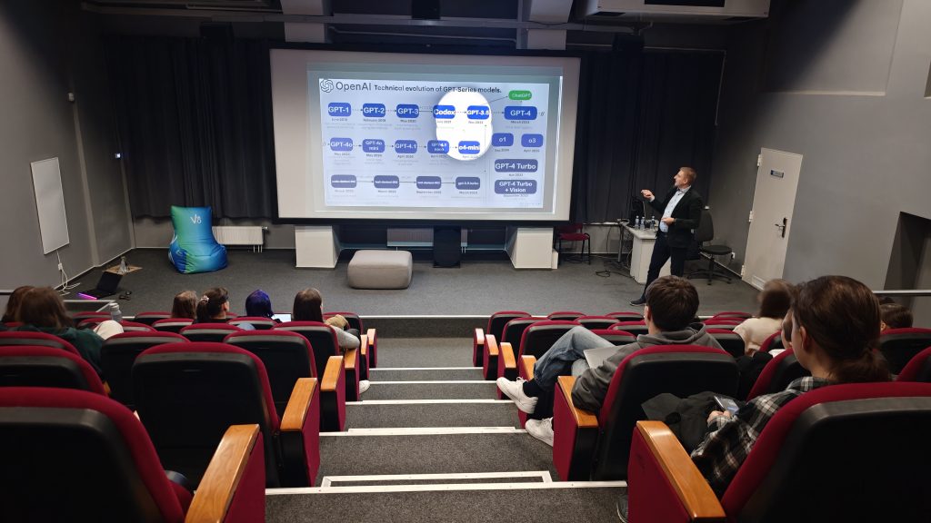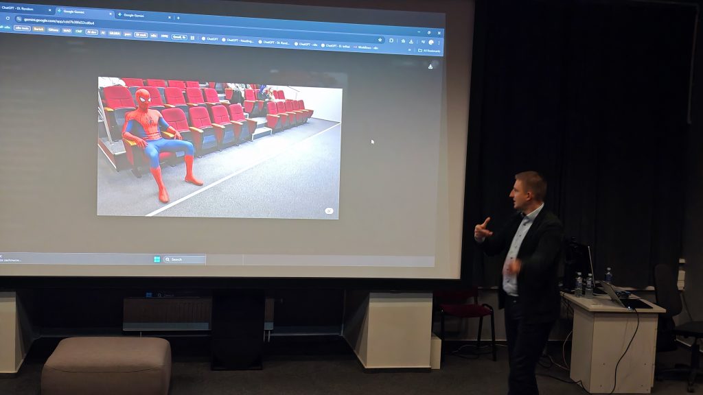 Paskaita praplėtė laisvai pasirenkamo dalyko „Dirbtinio intelekto pradmenys“ temų sąrašą ir buvo skirta susipažinti su dirbtinio intelekto ChatGPT funkcijomis, versijomis ir jų taikymu įvairiose srityse.